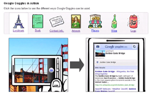 Google Goggles utiliza a fotos tiradas de seu celular para realizar consultas na internet. É ideal para objetos que podem ser facilmente descrito em palavras. Para utilizar o serviço não é preciso digitar nenhuma palavra nem utilizar um recurso de reconhecimento de voz para fazer a consulta. Tudo que é preciso é abrir o aplicativo, tirar a foto e esperar os resultados da busca.