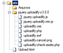 Com os arquivos necessários, você pode optar por utilizar os arquivos da biblioteca localmente ou direto do site do uploadify. Desta forma o acesso fica mais lento, porém a vantagem é que não há necessidade de copiar os arquivos em todos projetos que implementar Upload via jQuery.