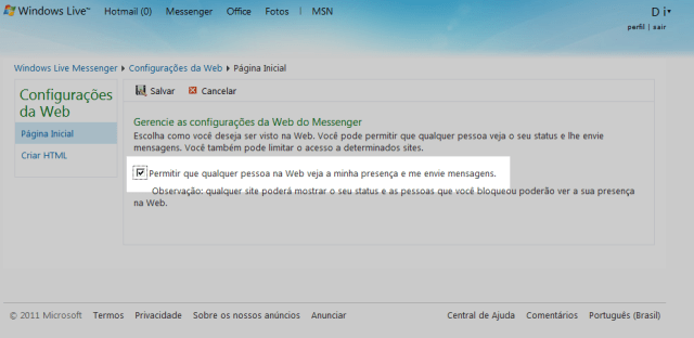Na página incial, marque a caixa de seleção com a mensagem “Permitir que qualquer pessoa na Web veja a minha presença e me envie mensagens. “