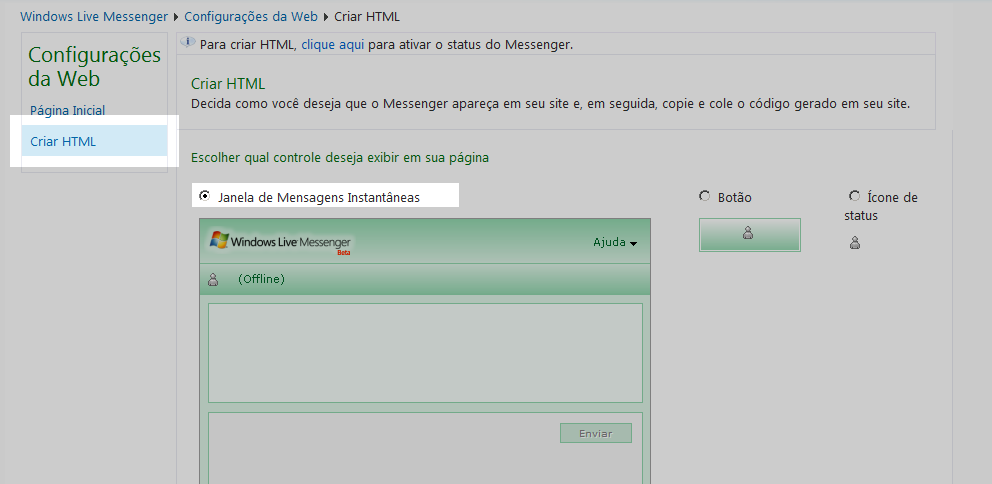 Acesse o link abaixo para iniciar a configuração do mensageiro. Caso não esteja logado no Windows Live suas credenciais serão solicitadas.